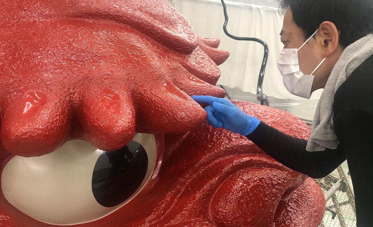 唐津くんちの曳山は、「和紙や漆、金箔などで仕上げられた世界最大級の乾漆造の美術工芸品」とされ、その美しさ、迫力は見事なものです。曳山そのものも、佐賀県の重要有形民俗文化財となっています。旧唐津城下にある14の町がそれぞれ曳山を所有しています。今回、保存修復の依頼があったのは、そのなかの水主町(かこまち)が所有する13番曳山の「鯱(しゃち)」でした。