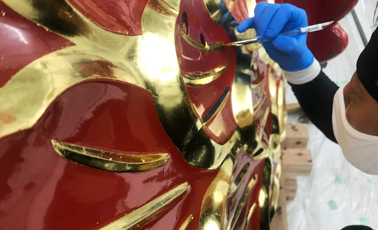 この鯱の修復は、伝統的に輪島塗の職人が手掛けてきました。今回は、輪島の田谷漆器店様が修復を担当することとなり、金箔については、技術的な信頼から箔一の名前をあげていただきました。最初にお声がけをいただいたのは、作業に入る2年ほど前のことでした。曳山の保存修復には、かなりの困難が伴うことはわかっていましたが、一定の準備期間もあり、こうした機会をいただいたことも成長のチャンスととらえて、まさに挑戦者の気持ちでお受けすることとなりました。