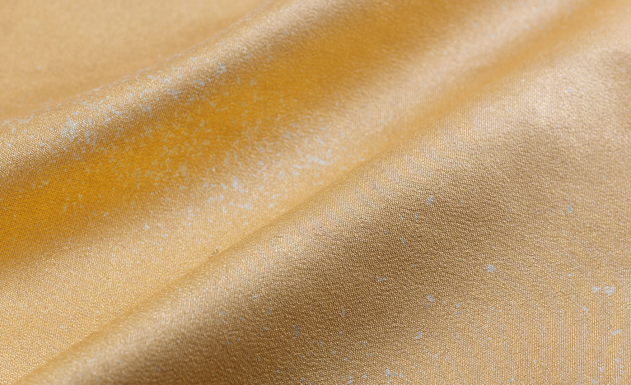 箔は、水と空気以外なら何にでも貼れるといわれます。しかし、1万分の1mmの金沢箔は、手で触ることはできず、吐息でも舞ってしまうほど繊細なもの。柔らかい素材に貼るのは、大変に難しいものです。その中でも、布は最大の難敵ともいえます。箔一では、この難易度の高いチャレンジを行い、布に箔を貼る技術を確立しています。