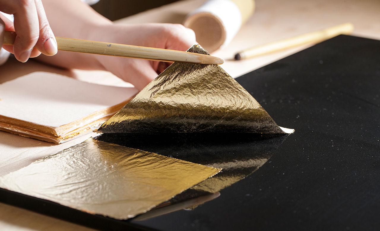 私たちは、作家様に金沢箔を使った作品作りに、積極的に挑戦してほしいと考えています。そのため、かつては一定のロット販売が常識であった金箔業界で、いち早く、一枚からでも注文していただける体制を整えました。また、箔を貼る技術も惜しみなく提供をしています。そのことによって、箔の伝統の担い手を一人でも増やしていきたいと考えているからです。初めて箔を使う方には、わかりやすい箔貼りの体験も提供しています。ぜひ気軽に、あなたの作品に金沢箔の優雅さを取り入れてください。