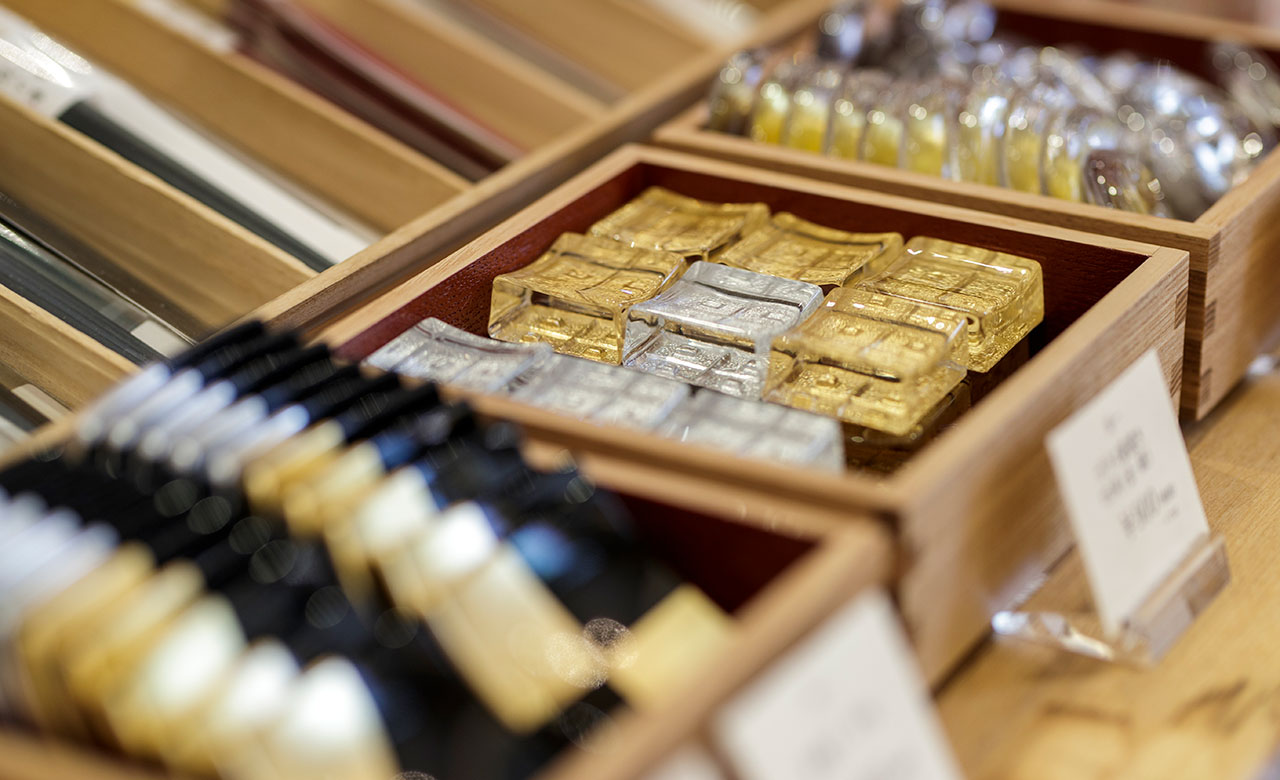 金沢箔工芸品は、売り場に優雅さと物語性をもたらします。金箔の美しい輝きは人々を魅了し、手仕事が生み出す繊細さが店頭を華やかにします。さらに、金沢箔には歴史や風土に裏付けられた物語があります。藩政期から450年近く続く箔打ちの歴史。それは、加賀藩の工芸振興策に育てられたものです。また、雪が多い北陸の気候は、豊かな水資源と辛抱強い気質を生みました。これらの要素が重なった結果、良質な箔が生まれ、現在では金箔国内生産量の98%以上を金沢が占めるようになりました。こうした物語が、御社の売り場の魅力となっていきます。