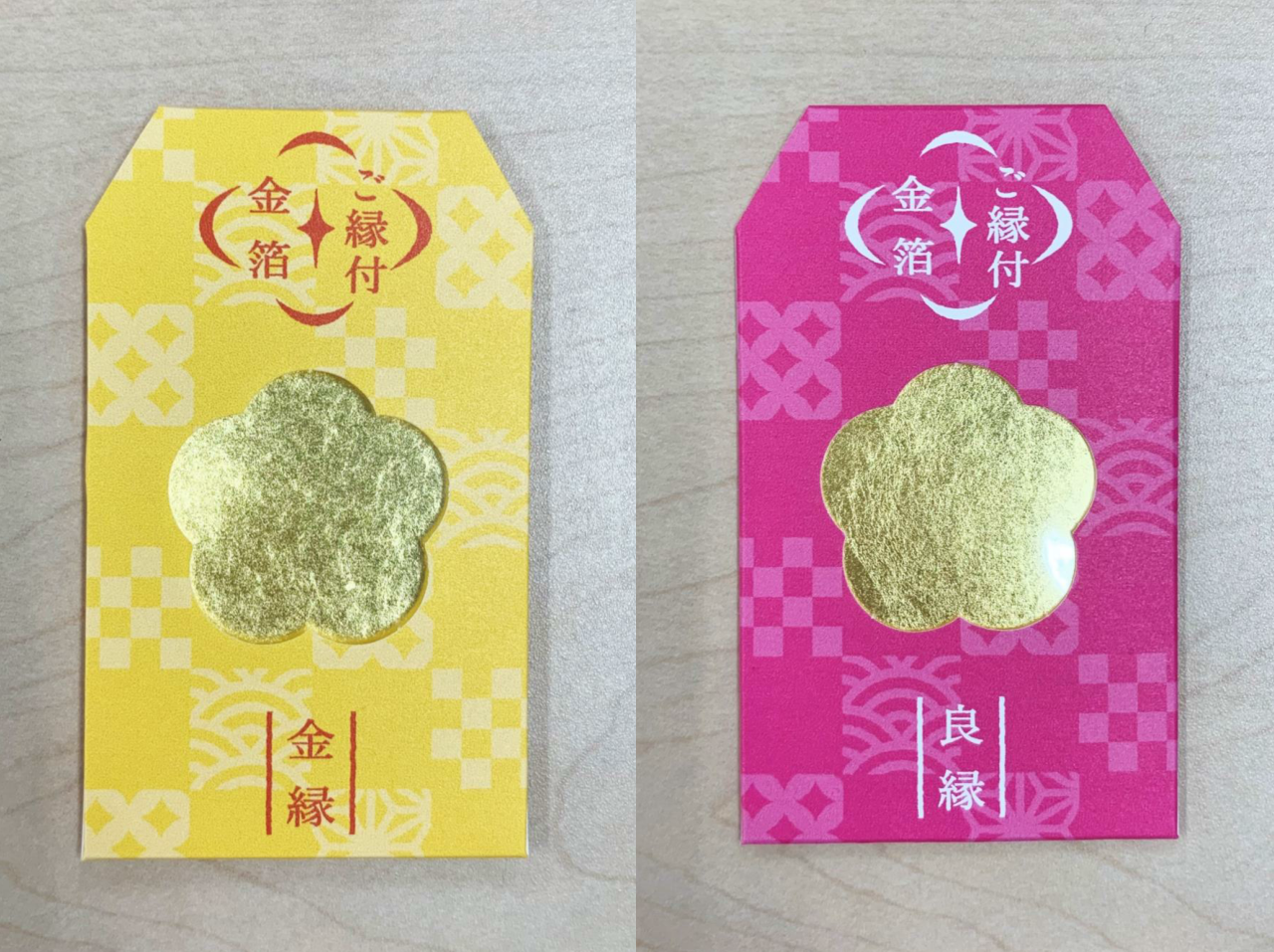 この「ご縁付金箔」は、店頭に並べる前に、市内の神社にて祈祷をしていただいています。金沢に訪れる方々に、またこれから受験や就職などといった新しいチャレンジが控えている方々に、よいご縁が訪れるようにという願いを込めています。