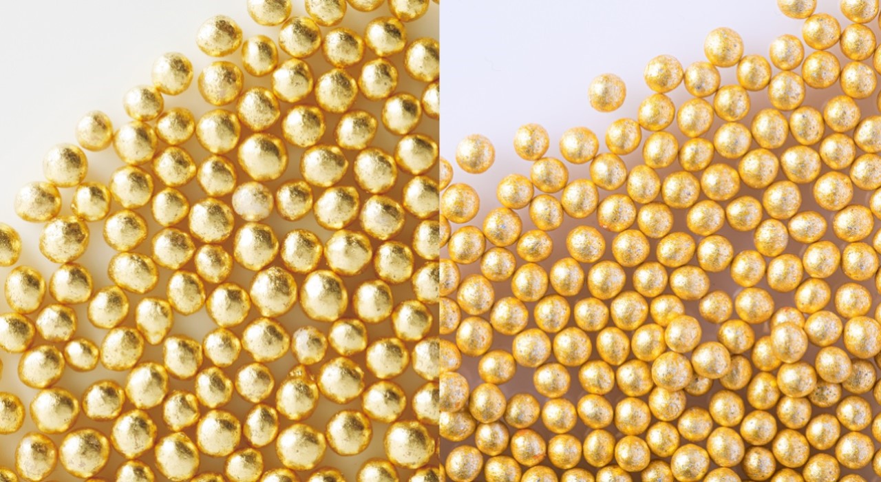 金は極めて美しいものですが、非常に希少な資源でもあります。また、資産価値も高いことから世界情勢が不安定になると、価格が高騰する傾向もあります。今回のアラザンは、シルバーを用いながら、植物由来のカロチンで着色を施すことでゴールドの輝きを表現しました。本物と見間違えるほどの輝きを持ちながら、価格は極めて低く抑えられています。