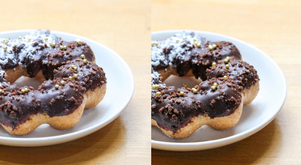 ドーナッツにイエローゴールドのアラザンをあしらい、社内テストを行いました。結果、ほとんどの人が、見わけがつかないと回答しました。近くでよく見れば、本金の輝きの素晴らしさも感じますが、スイーツにあしらった時点では、ほとんど遜色ないといえるでしょう。(左/ゴールド、右/イエローゴールド)