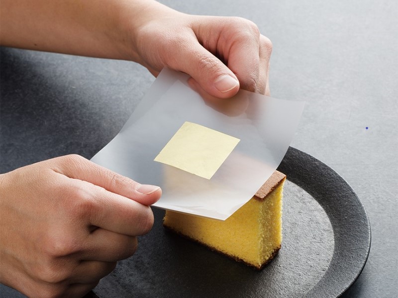 相談を受けた箔一では、今回のプロジェクトのために特別仕様の金箔を制作しました。ベースになったのは「かんたん金箔」です。これは、微弱な静電気を帯びる特殊なシートに金箔をのせて安定させる手法で、シートの部分を持つことで誰もが簡単に金箔をあしらえます。食品に触れると、食材の持つ水分に金箔が接着しスムーズに移動させることができます。工芸品の分野では「あかうつし」という手法がありますが、これを衛生的でより静電気の少ないシートを用いて食品に応用したのが、箔一オリジナルの「かんたん金箔」です。今回は、長さ18㎝の恵方巻のために、特注サイズのシートを制作しました。