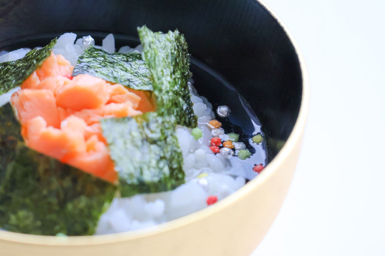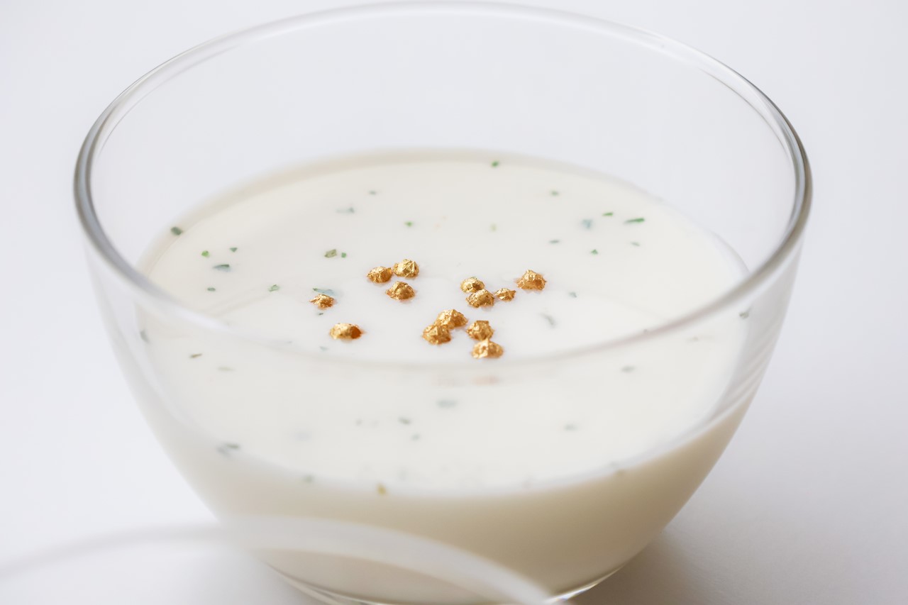 金箔あられは、かりっと香ばしいもち米100%のあられに、伝統の金箔・銀箔をあしらった新しいタイプの食用金箔トッピング材です。これまでなかった食材や料理に使えることから、料理の新しい可能性を広げるものとして注目を集めています。