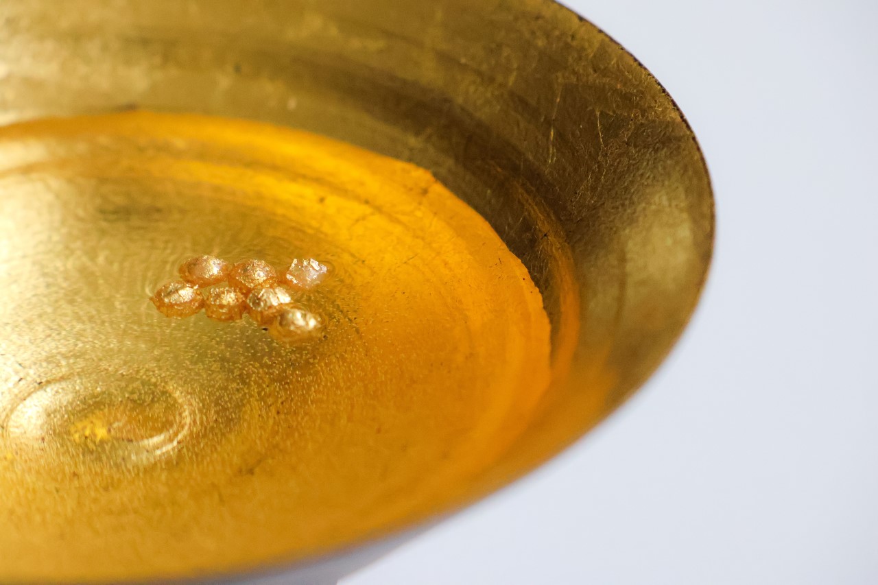 金箔あられは、手で扱うとができます。強く触らなければ、箔がはがれることはありません。